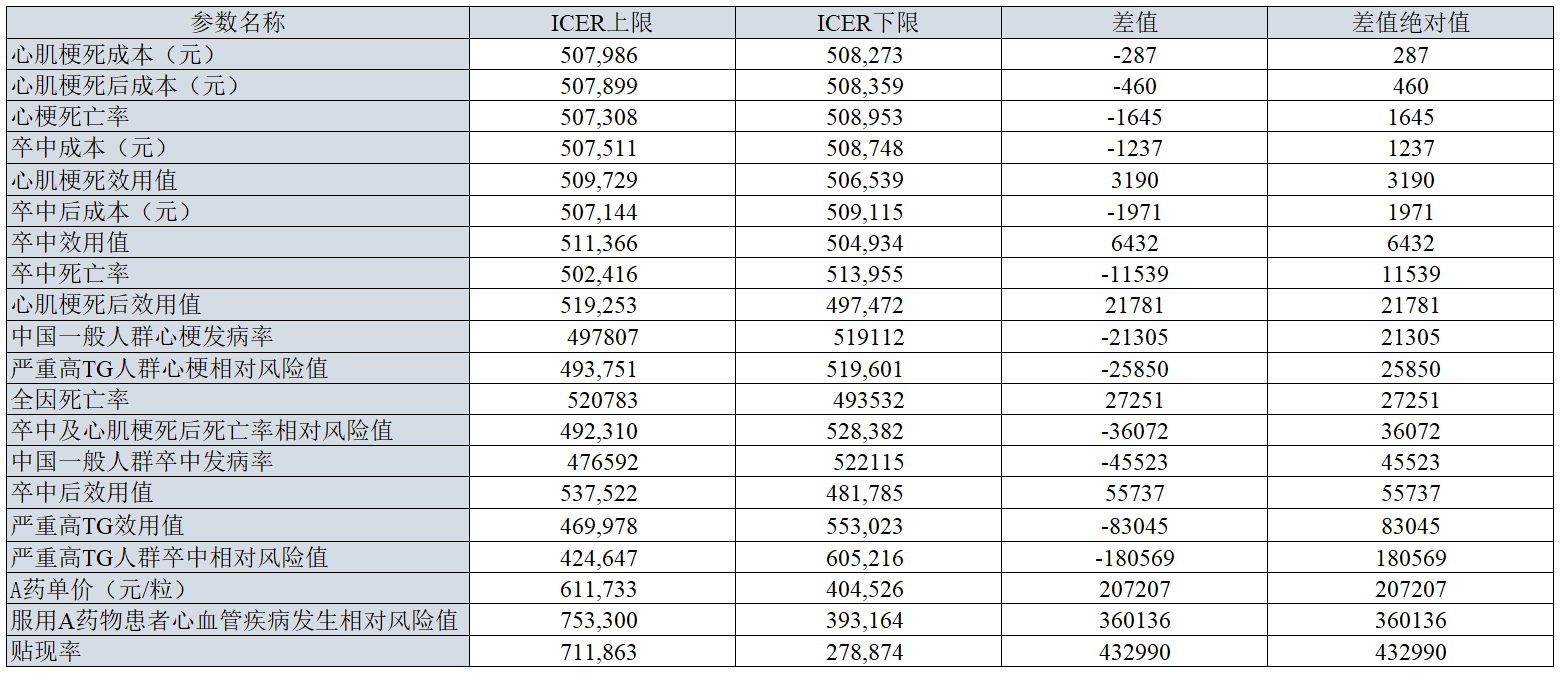 数据包括:参数、ICER下界、ICER上界、ICER上下界差值、差值的绝对值