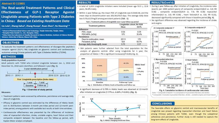 METHODS: Data were collected from the hospital information system database covering 10 tertiary hospitals in Tianjin, China. Adult patients with T2DM who initiated liraglutide between January 1, 2016 and December 31, 2018 were identified, and followed up to December 31, 2019. Glycemic control was assessed by the differences in HbA1c levels and percentages of patients who achieved HbA1c <7% between 3-month pre-index period and 12-month post-index period among patients with available test results at both time windows. Incidence rates (events per 1000 person-years) of cardiovascular events including myocardial infarction, stroke, unstable angina, heart failure and their composite endpoint were compared by Exact Poisson Tests between baseline and the follow-up period.